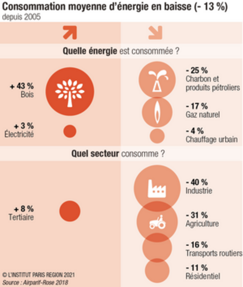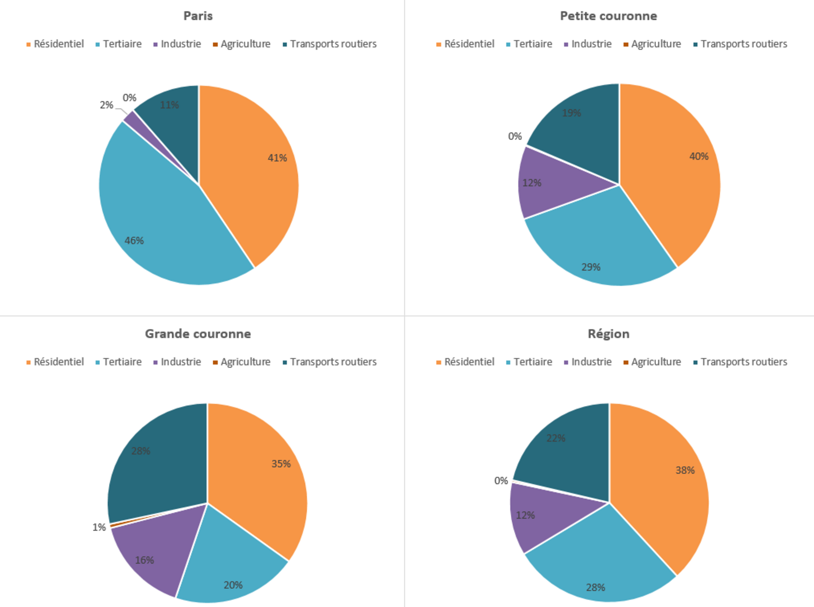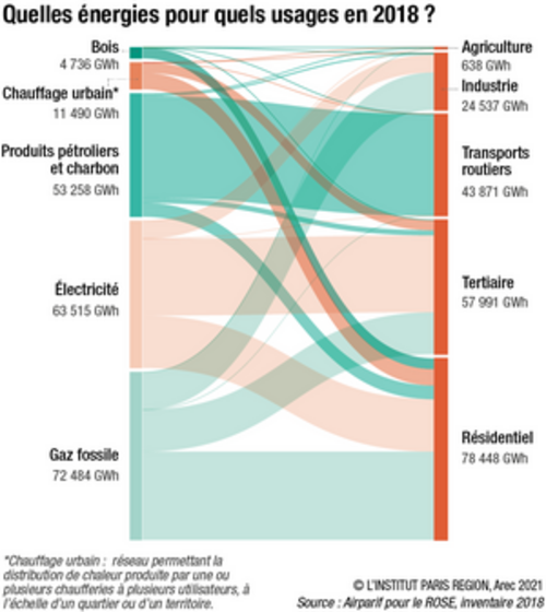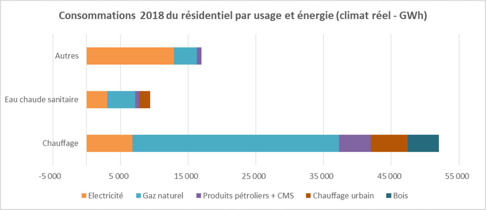 Il faut donc retenir que la part des énergies fossiles dans ces consommations reste particulièrement importante puisqu’elle s’élève à plus de 70% directement via les consommations de gaz fossile et de produits pétroliers / charbon et à travers les consommations de chauffage urbain, alimentés eux aussi à près de 50% par des énergies fossiles (gaz fossile essentiellement).